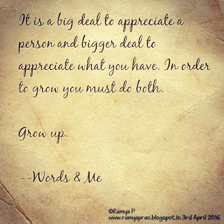 Appreciation when comes from heart, one can feel. I know, because when someone appreciates me wholeheartedly, I can feel the warmth and I am grateful. The cloud 9 feeling, you could say. When all your efforts are addressed ,looked upon and praised for ,there is a feeling of nobility and respectfulness . A bad day turns into a good one and the world seem to be a better place.